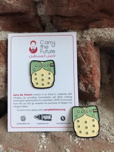 The Punk Mamas crew was inspired to do something to help refugees after being inundated with image after image of injured and dead Syrian children in the media. One mother’s feeling of utter helplessness spawned a group-wide discussion of how one could make a difference to those suffering on the other side of the world. As the group brainstormed ways to help, they discovered Carry the Future, started by a mother, and felt a strong connection toward the non-profit’s mission to, “stand in solidarity with refugee families worldwide by providing humanitarian aid to ease their journey while creating meaningful opportunities for global volunteers to be a collective force of action and hope.” Having successfully completed a massive effort of collecting over 18,000 gently used baby carriers and distributing them to Syrian refugees, Carry the Future is now focused on providing baby boxes full of essential baby items (bedding, clothes, toiletries, diapers, etc.). Lemon Lightening and Good Good Pins have kindheartedly collaborated with Punk Mamas to create, produce, and distribute this cloth diaper pin. With your purchase, 100% of proceeds will go directly to Carry the Future to provide disposable diapers for Syrian refugee babies in Jordan.